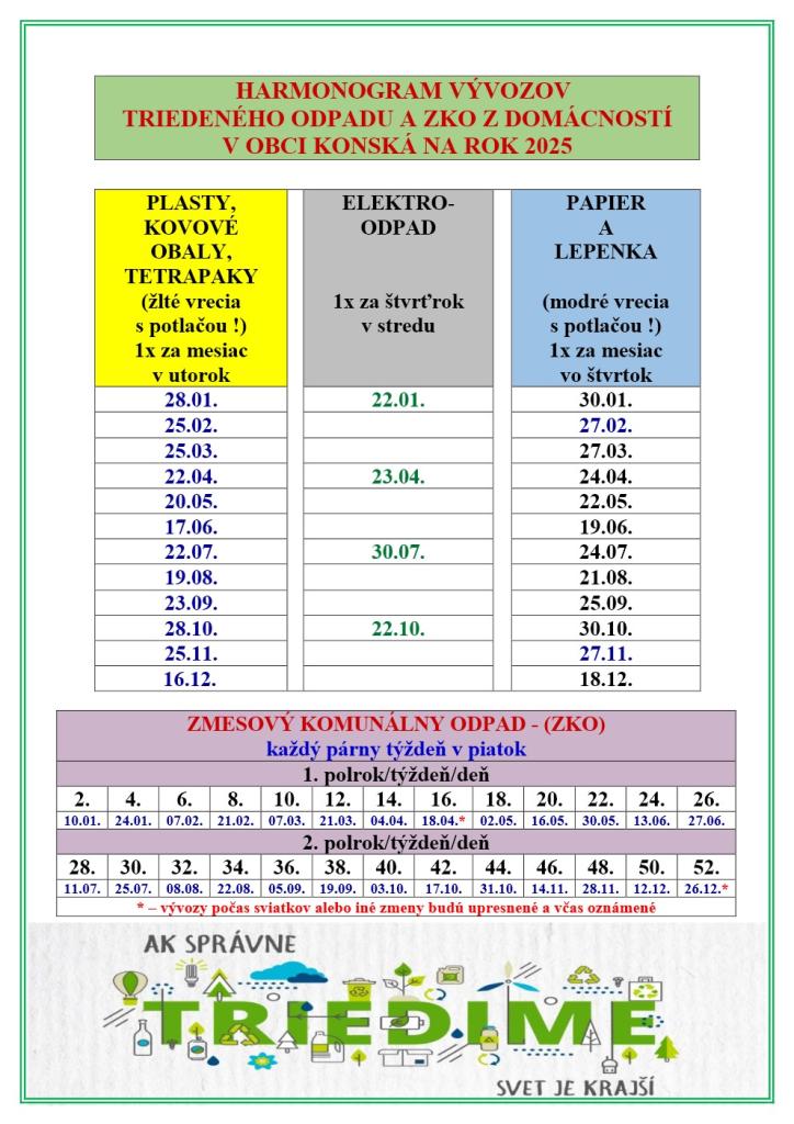 HARMONOGRAM VÝVOZOV TRIEDENÉHO ODPADU A ZKO - ROK 2025
